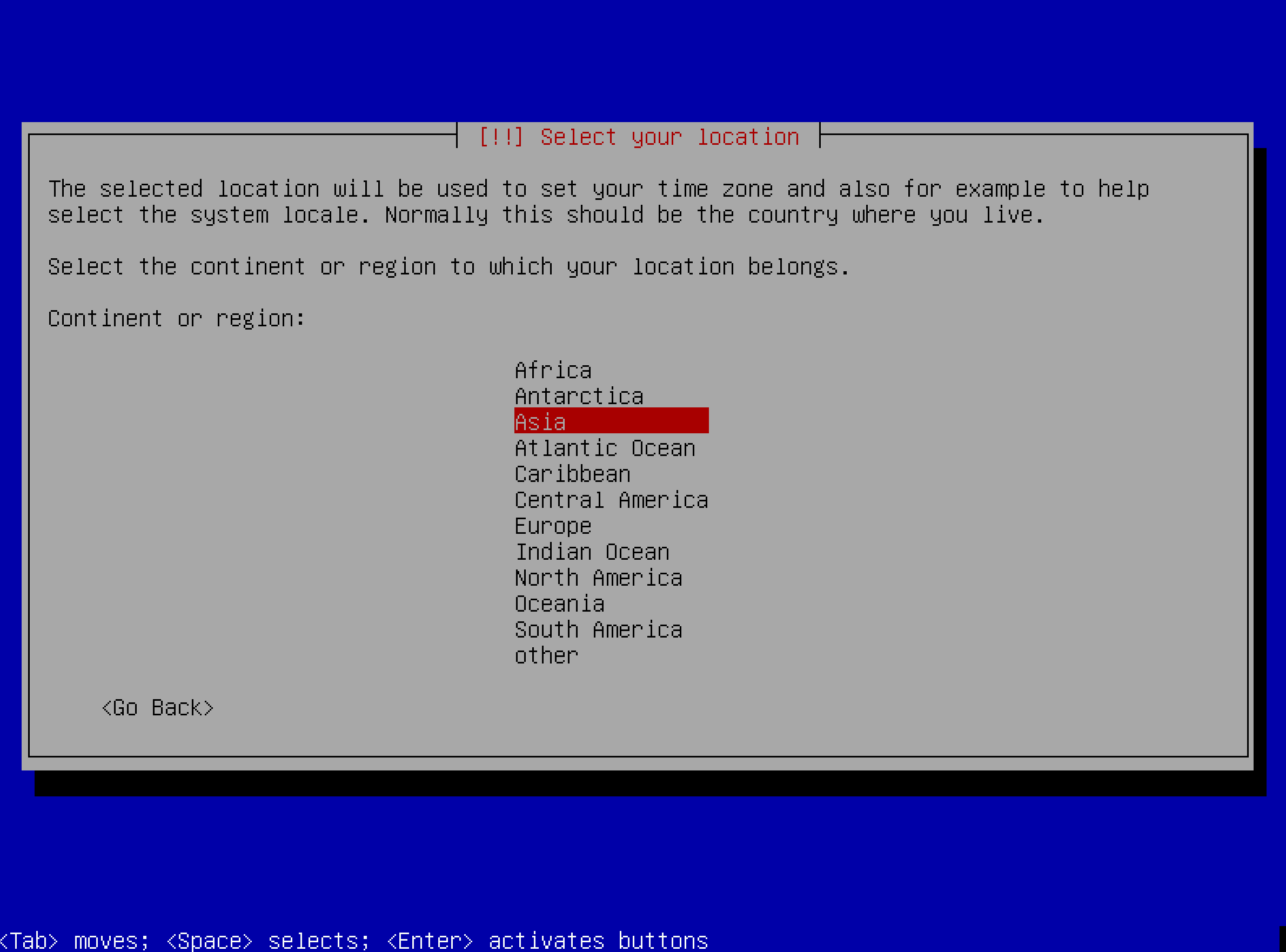 현재 위치에 맞는 시간대를 선택합니다. 현재 설치하는 위치는 대한민국이므로 아시아, 대한민국을 선택해야합니다.