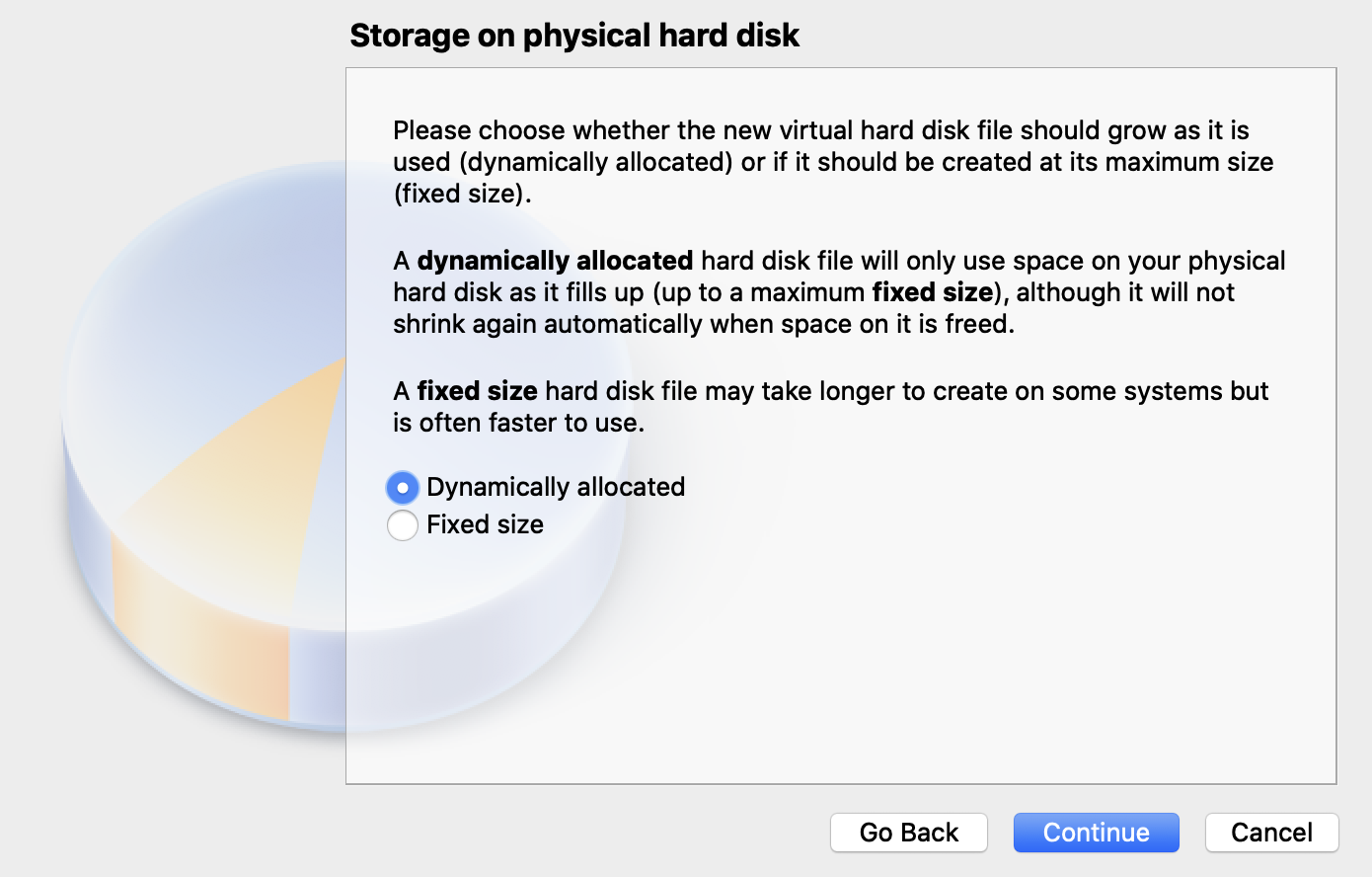 Virtualbox에서의 하드디스크 동적할당 설정을 합니다. 동적할당을 선택하면 용량을 덜 사용해도 덜 사용한 공간을 사용할 수 있습니다. 동적할당을 선택하도록 합니다.