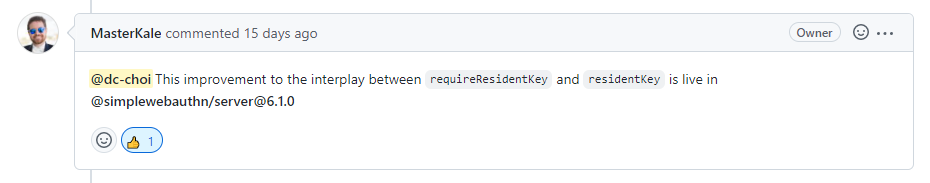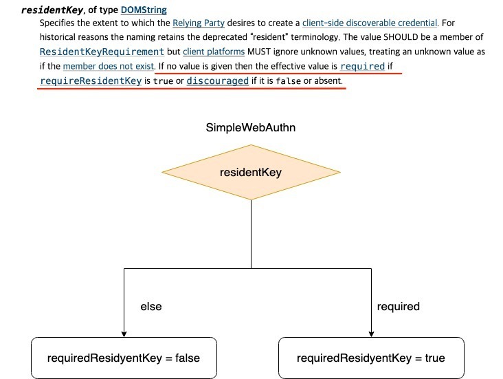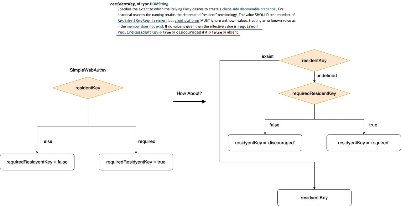 SimpleWebAuthn에서는 빨간 줄로 강조한 부분을 지키고 있긴 하다. 하지만 이렇게 될 경우 Level2의 인증밖에 받을 수 없다. FIDO Alliance에서는 Level2 인증을 받기 위해서는 기본적으로 Level1에 해당하는 부분도 지켜져야 한다고 규정하고 있다. 하지만 지금 코드로는 Level1을 통과할 수 없다. residentKey가 무조건 undefined로 들어오기 때문이다. 그렇기에 다음과 같이 변경해야 한다고 이슈에 남겼다.