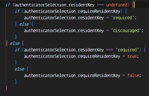 문제가 발생한 부분은 residentKey라는 부분에서 발생하였다. WebAuthn에서는 Level2에 해당하는 인증을 받게 될 경우 residentKey 부분이 추가가 된다. 하지만 우리가 받으려는 FIDO인증은 Level1에 해당하기 때문에 해당 속성이 undefined로 들어오게 된다. 코드를 직접 보여줄 수 없기에 사진으로 SimpleWebAuthn에서 어떤 식으로 구현했는지 설명하려고 한다.